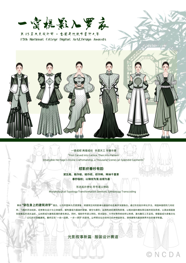国赛二等奖(部分): 作品名称:《一窗棂影入罗衣》 设计者:杜嘉仪 指导老师:纺织与服装学院——董雅林 设计说明:秉持“穿在身上的建筑诗学”理念。以苏州园林为灵感,将建筑空间的韵律,融入服装的动态美学,打造深庭古韵。