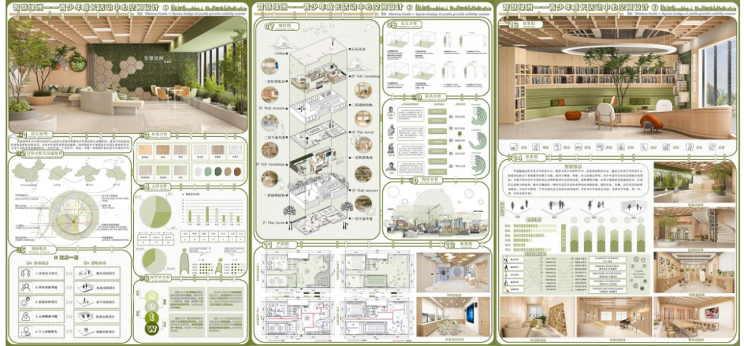 国赛三等奖(部分): 作品名称:《智趣绿境青少年成长活动中心空间设计》 设计者:周悦 指导老师:艺术与设计学院——迟亦然 设计说明:智慧绿洲青少年成长活动中心的设计初衷是帮助青少年度过成长过渡阶段,通过丰富的活动内容和多样的空间布局,为青少年提供多样化的选择,响应国家关于加强青少年综合素质教育、促进青少年全面发展的号召,与龙口市的文化底蕴相结合,旨在打造一个集学习、交流、实践为一体的现代化青少年成长平台,为青少年提供充满智慧、绿色、健康和活力的成长活动空间。