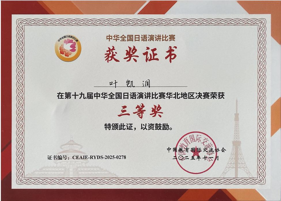 11月16日,第十九届中华全国日语演讲比赛(华北赛区)在天津外国语大学成功举办,烟台南山学院叶凯润同学凭借扎实的日语语言功底和出色的临场发挥,荣获大赛三等奖,是烟台南山学院在此赛事上取得的第一个奖项,实现了学校在该项高水平赛事中奖项零的突破。