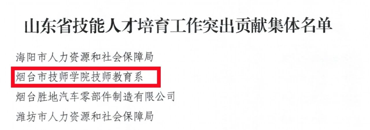 近日,山东省人力资源和社会保障厅正式公布表彰决定,烟台工程职业技术学院被授予“山东省技能人才培育工作突出贡献集体”荣誉称号。